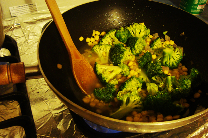 Día 3: Busqué en la extensa librera con, valga la redundancia, libros de cocina. Saqué aquel de “recetas fáciles” porque era para un viernes y tenía un poco de pereza. Una rica (o no tanto?) pasta con brócoli, elotitos, pollo y parmesano. No biggie. Preparar la pasta y en el wok sauté-ar cebolla, luego los brócolis, el pollo, por último los elotes y un poco de maicena para espesar (esa fue mi parte menos favorita creo yo).