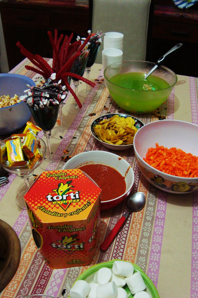 Obvio no podía terminar el artículo sin hacer mención especial a la cantidad de cochinadas y chucherías que comimos para Halloween con los primos: tostadas, peanut butter popcorn, plataninas, ponche de Mountain Dew con jugo de piña y gusanos, dulces, dulces, dulces y más dulces, cerveza (ew, lo sé), cheetos, en fin…
