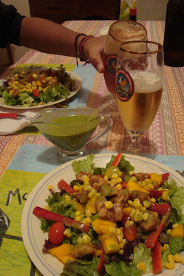 Sirvan la ensalada con la cantidad de aderezo que quieran y acompáñenla de un buen vino blanco o rosado frío, o en nuestro caso, con cerveza porque eso fue lo que se antojó a la afición.